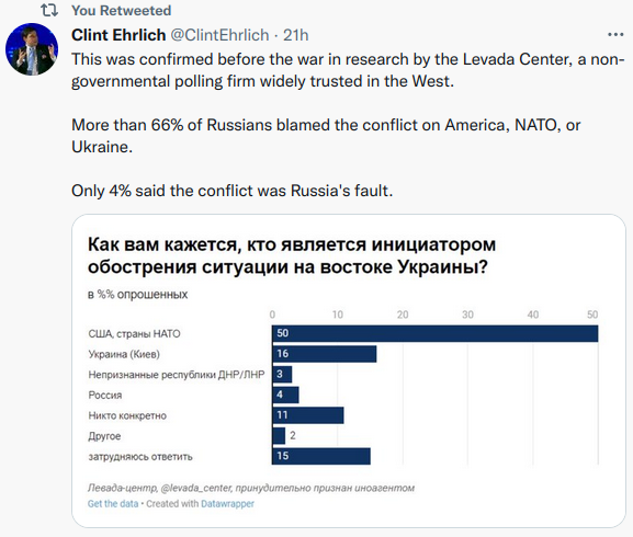 Polling – 66% of Russians blame conflict on America(50%), NATO, or Ukraine, 4% on Russia.