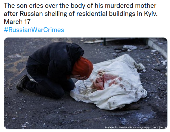 Son cries after mother killed in shelling. Kyiv yesterday.