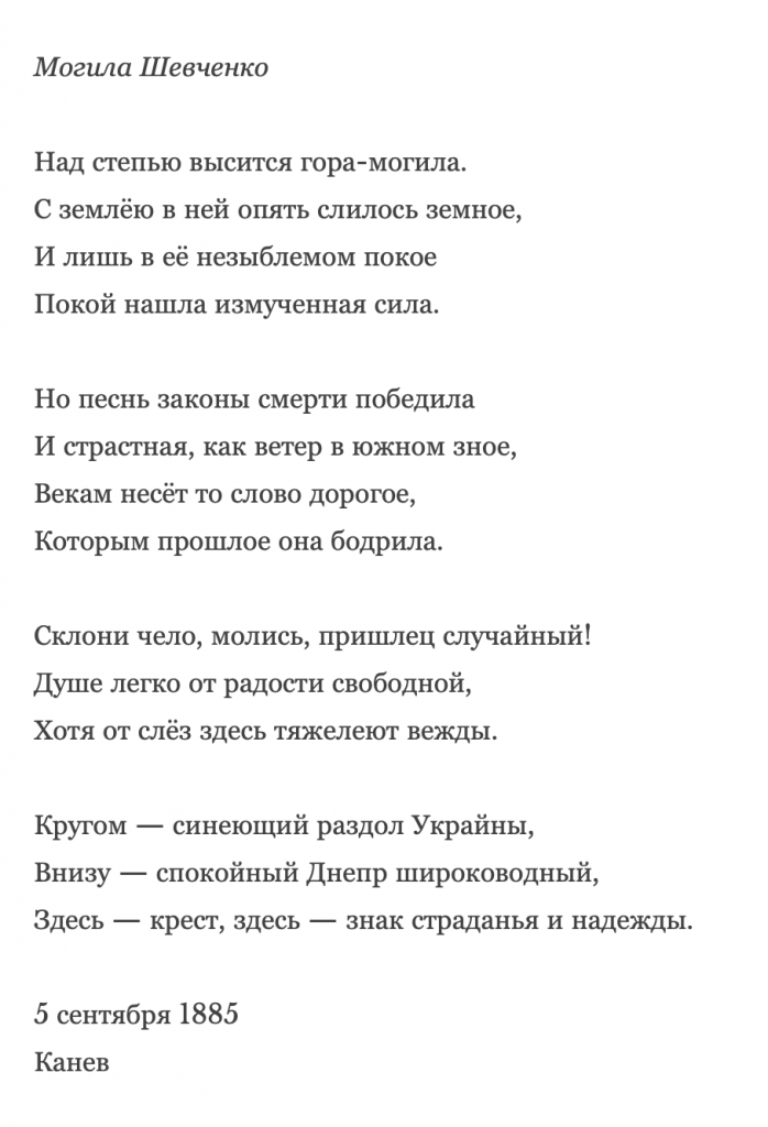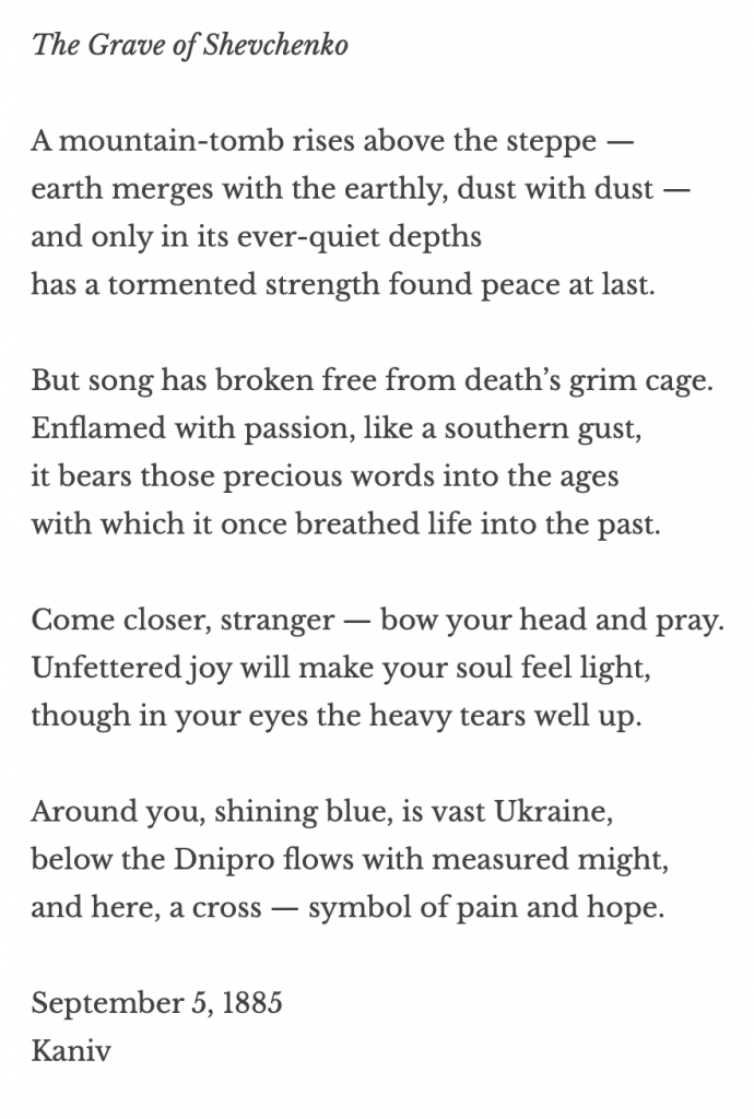 More about the work and the obscure poet here: https://bdralyuk.wordpress.com/2022/05/01/symbol-of-pain-and-hope-on-pyotr-buturlins-the-grave-of-shevchenko/